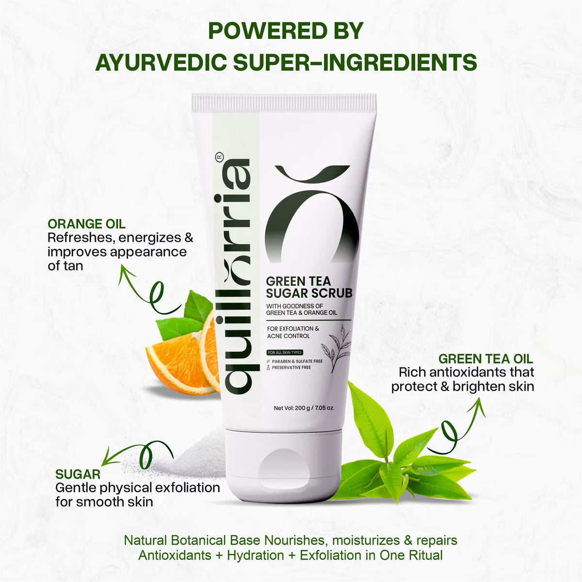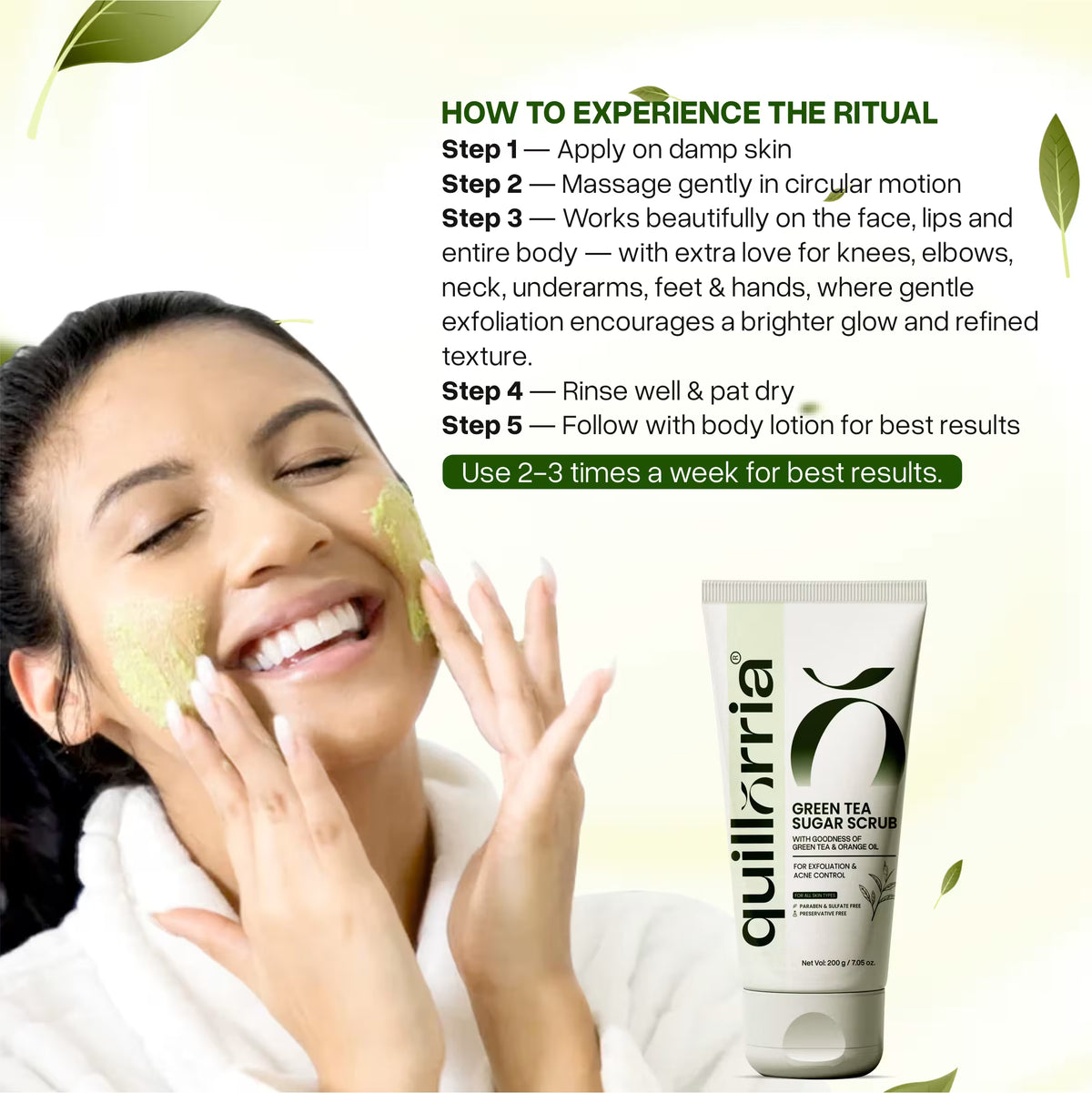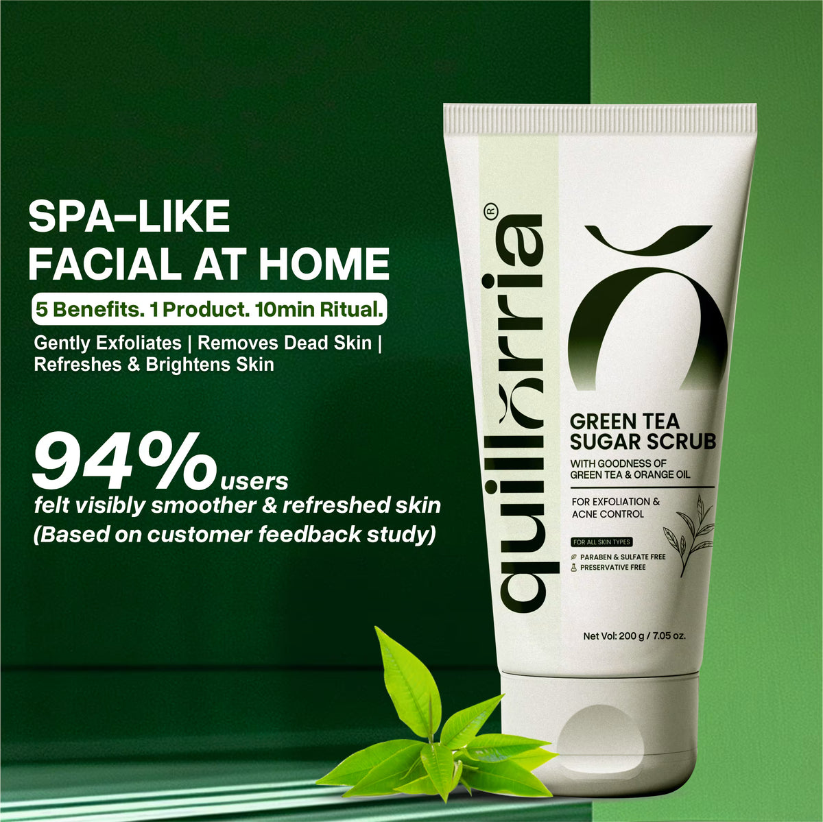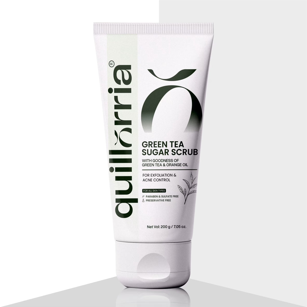 Crafted for oily, dull, and acne-prone skin, Quillorria Green Tea Sugar Scrub blends antioxidant-rich green tea and fine sugar to gently exfoliate and clarify. Infused with refreshing orange oil, it helps purify pores, control excess oil, and leave skin smooth, fresh, and naturally radiant—never dry or over-cleansed.