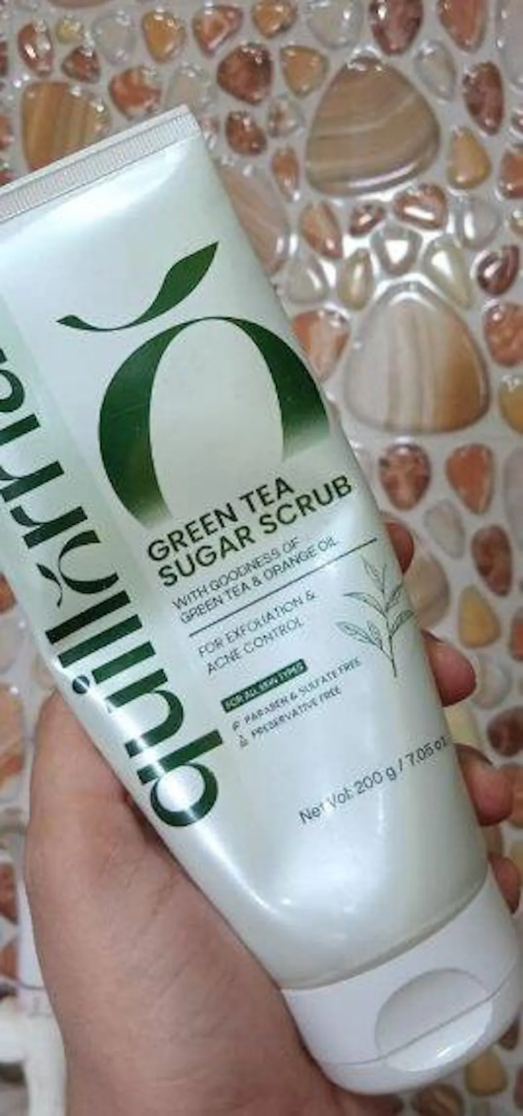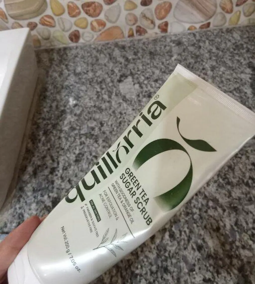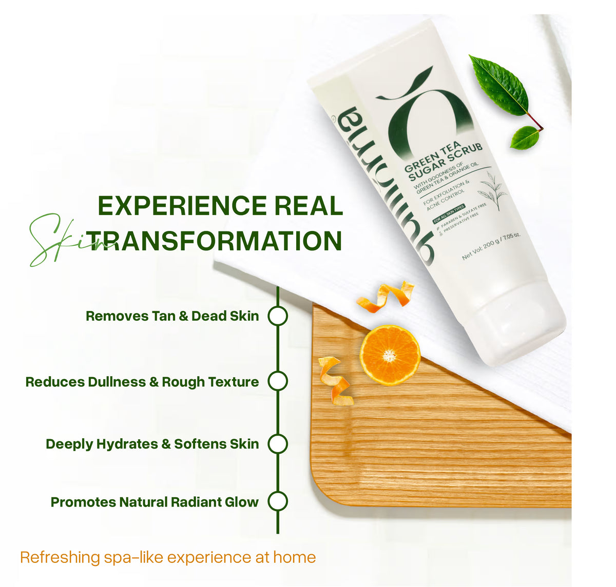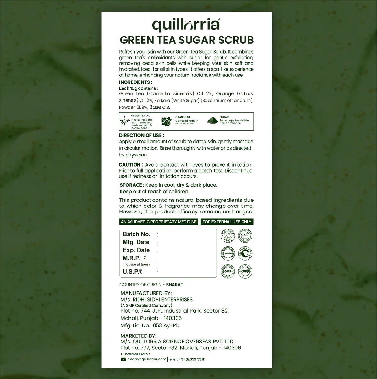Crafted for oily, dull, and acne-prone skin, Quillorria Green Tea Sugar Scrub blends antioxidant-rich green tea and fine sugar to gently exfoliate and clarify. Infused with refreshing orange oil, it helps purify pores, control excess oil, and leave skin smooth, fresh, and naturally radiant—never dry or over-cleansed.